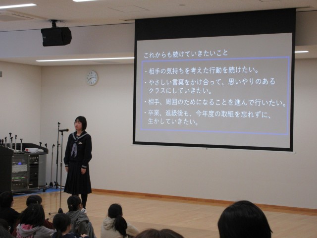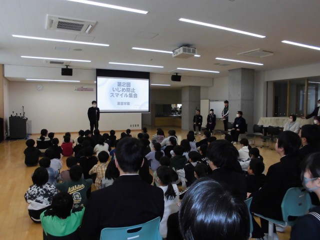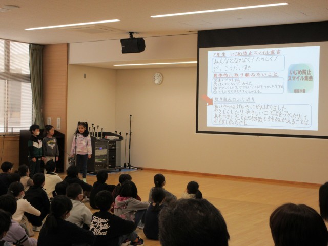 2月4日(水)  「いじめ防止スマイル集会」が開かれました。藤里学園では、いじめのない学校づくりのために、どうしたらいじめをなくすことができるかを各学年ごとに話し合って実践してきました。この日は各学年の取り組んできたことを紹介し合い、いじめのない学校づくりのためにこれからも続けていくことを確認しました。